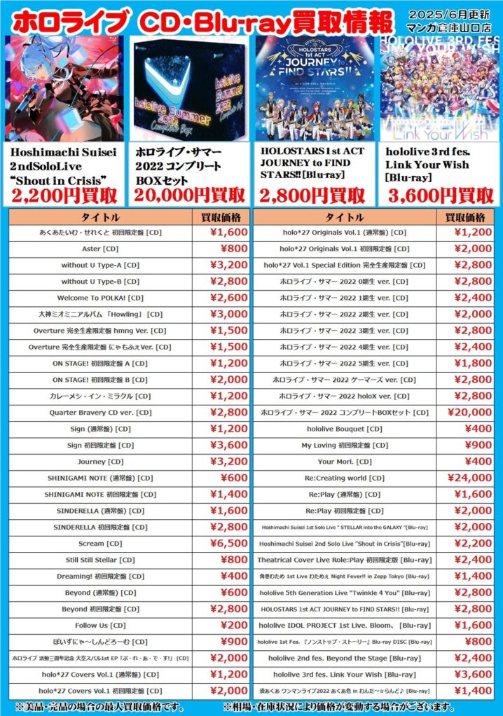 CD・DVDコーナーからのお知らせ! 現在当店では人気VTuberグループ「ホロライブ」の作品を買取強化中! 楽曲CDはもちろん、ライブを収録したBlu-ray、関連グッズも全力で買取させて頂きます! 人気アニメのエンデ…
