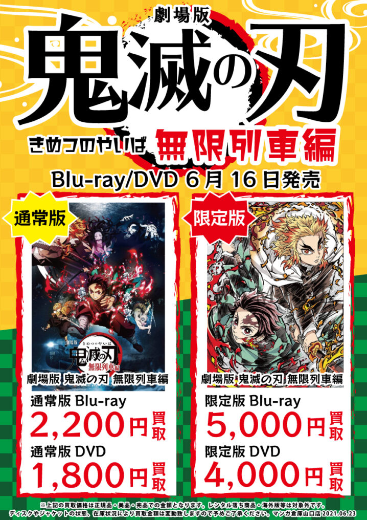 ★買取情報★ ただいまマンガ倉庫山口店では 劇場版 鬼滅の刃 無限列車編 Blu-ray&DVDを買取強化中です! ▼通常版 ブルーレイ:2,200円買取 通常版DVD:1,800円買取 ▼限定版 ブルーレ…