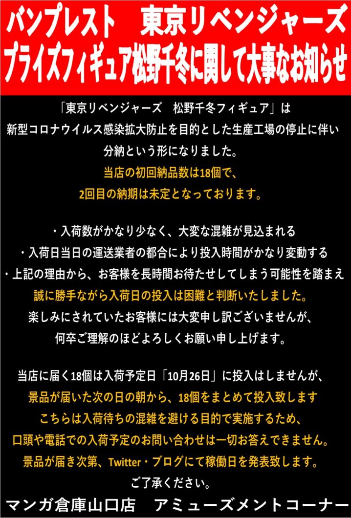 ★アミューズメントコーナーよりお知らせ★ 東京リベンジャーズ 松野千冬フィギュアについて大切なお知らせです。 納品数が大変少ないため、景品が届いた次の日に稼働させます。 景品が届き次第、稼働日の発表を致しますので、ご理解…