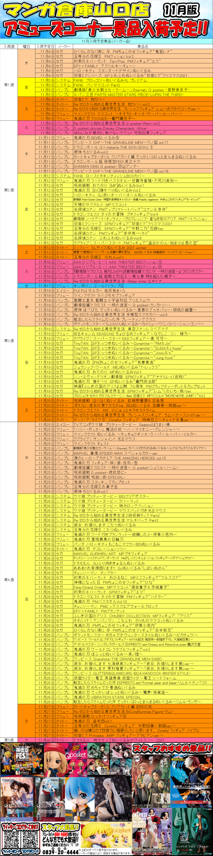 ★1Fアミューズメントコーナーよりお知らせ★ 11月の入荷景品表です!