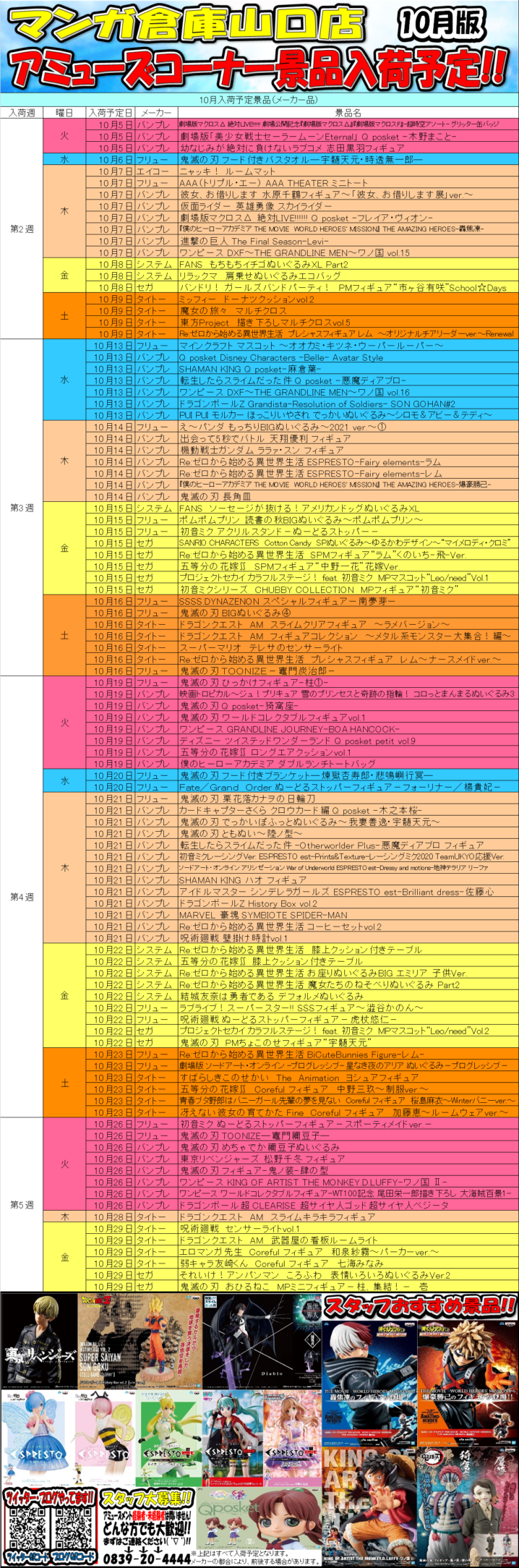 ★1Fアミューズメントコーナーよりお知らせ★ 10月の入荷景品表です!