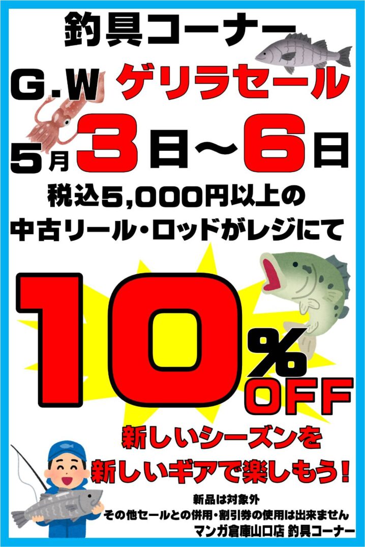 本日より6日まで 釣具セール開催中です! 税込5,000円以上のリール、またはロッドが10%オフになります! これからのシーズンに新しいギア、今年から釣りを始めてみようかな?と思われている方は是非マンガ倉庫山口店へお越し…