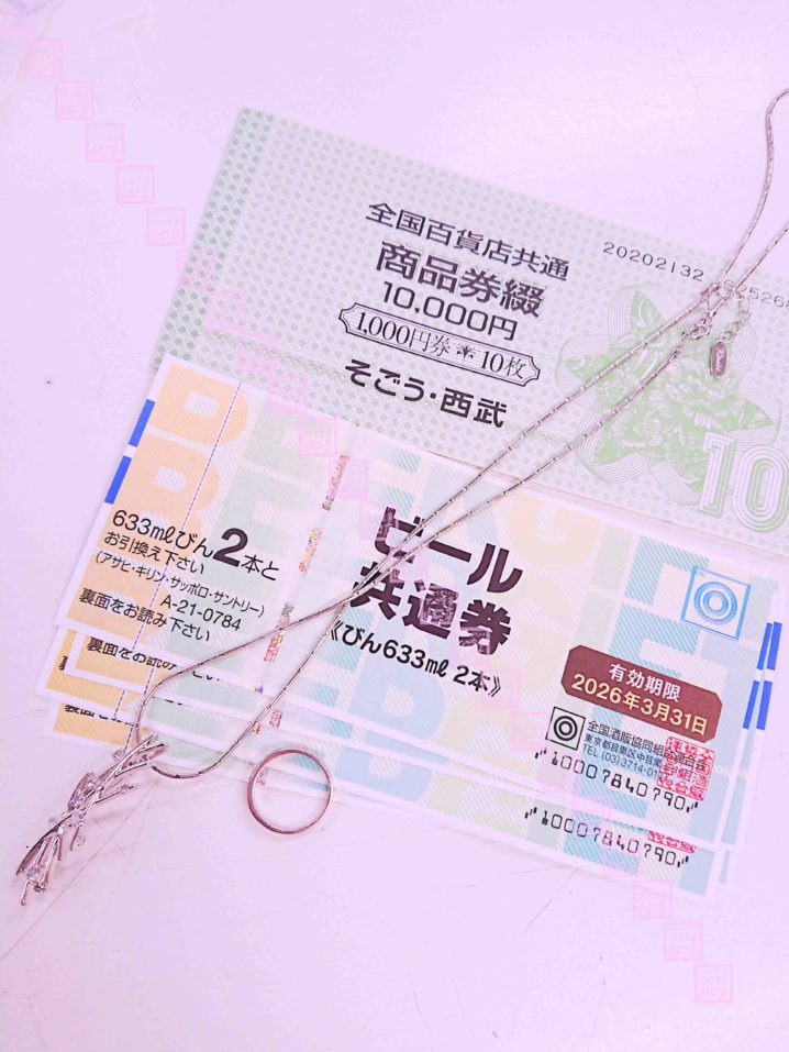 ・プラチナネックレス、指輪 ・全国百貨店共通商品券(そごう・西武) ・ビール共通券 (アサヒ・キリン・サッポロ・サントリー) 買取りました! 買取ありがとうございます! 商品券・ギフト券の買取ならマンガ倉庫山口店へ!
