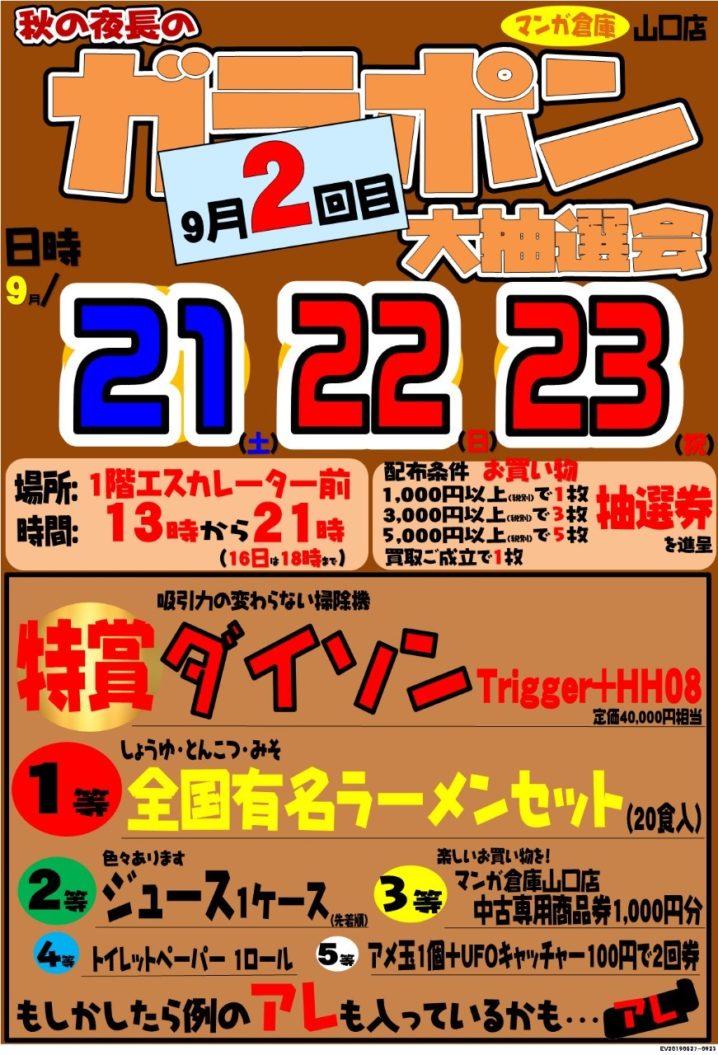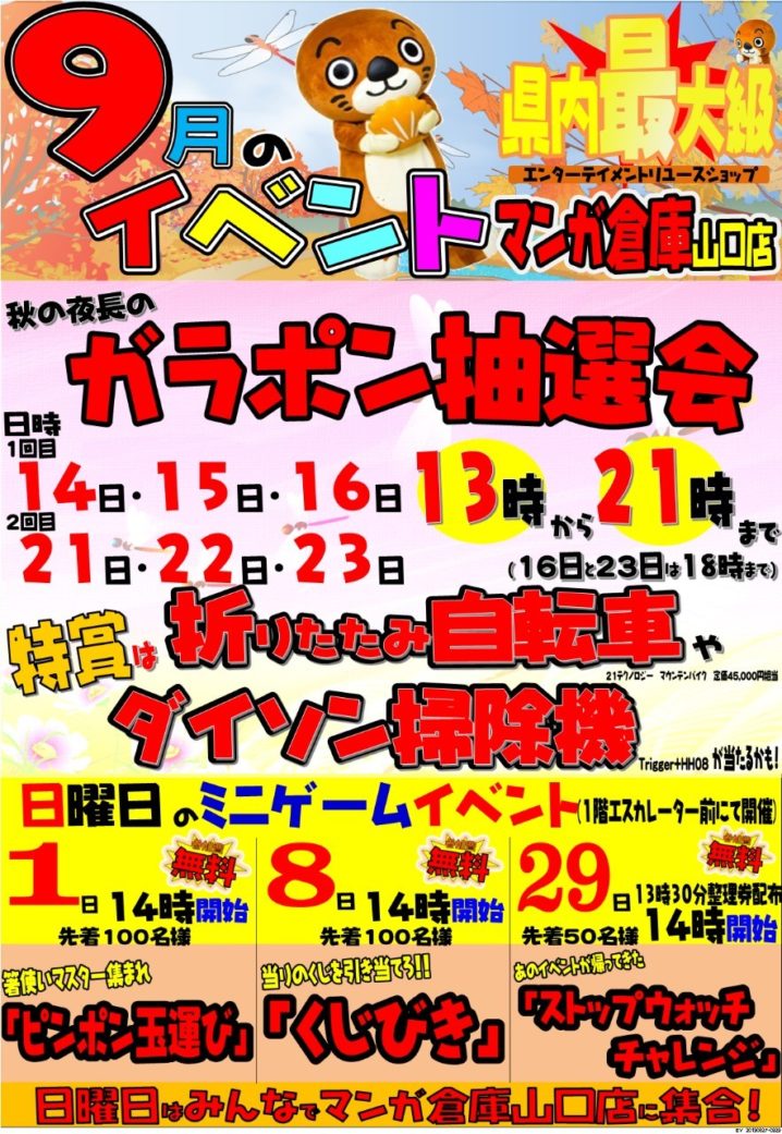 マンガ倉庫山口店9月のイベントご案内! 週末BINGOやガラポン抽選会、日曜日のミニゲームイベントなどなど盛りだくさんです! ★9月の毎週日曜日は週末BINGO!★ 参加費はもちろん無料! 今月は17時から開催いたします…