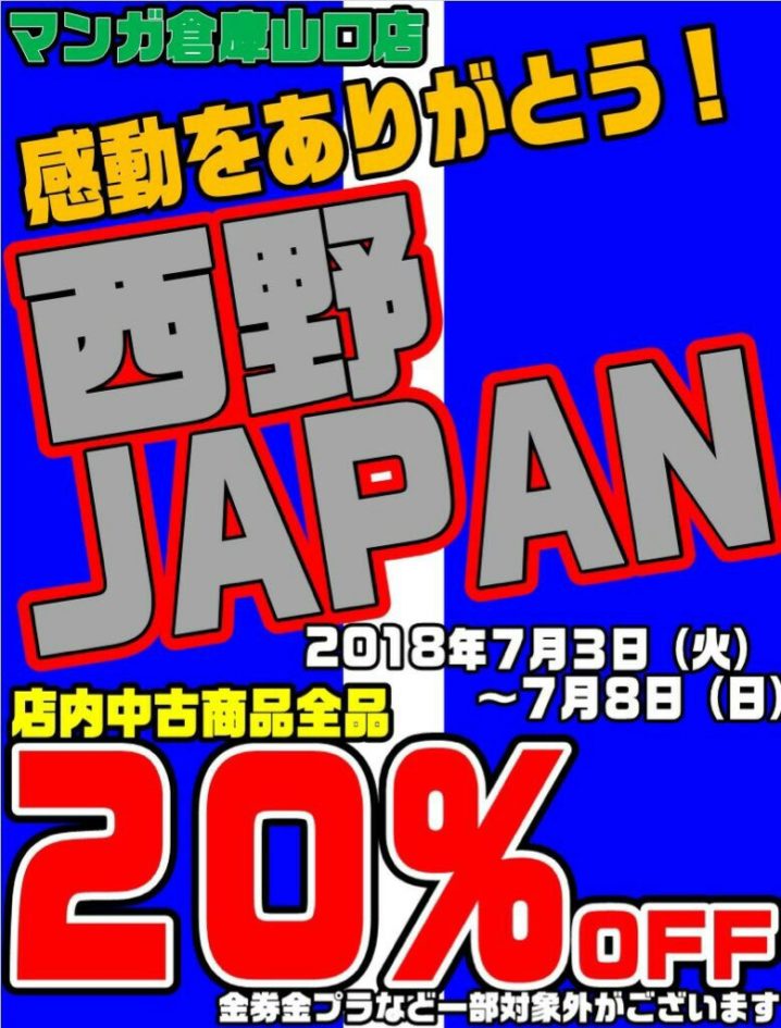 本日7/8のイベント・セールご案内です! ★感動をありがとう!西野Japan! 中古商品全品20%OFFセール★ 店内中古商品が超お買い得なセール!本日までとなっております!この機会に是非お買い求めください♬  …