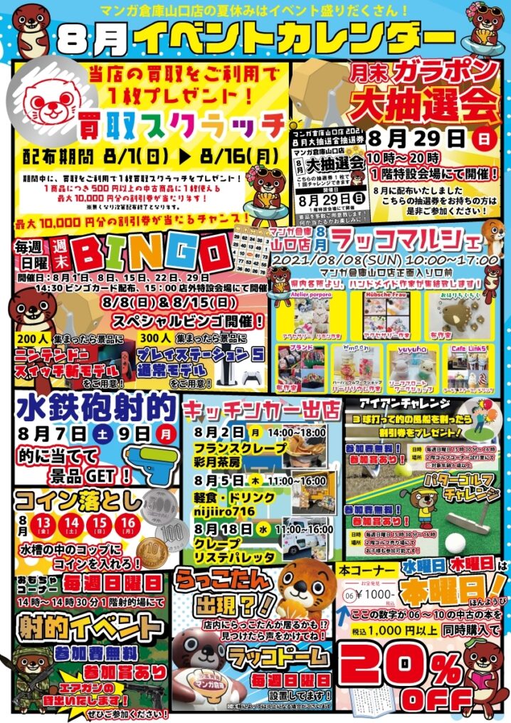 ★イベント情報★ 8月もマンガ倉庫山口店はイベントが盛りだくさんです! 8月8日朝10時からはラッコマルシェ! 8月1日から16日までは買取スクラッチ配布イベントを開催いたします! 8月29日…