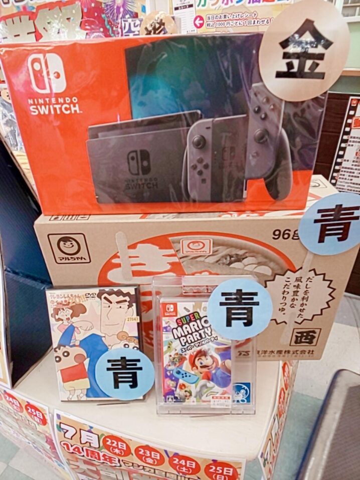 本日24日も マンガ倉庫山口店では 14周年大創業祭ガラポン抽選会を開催中です! 本日の景品はこちら! 金●ニンテンドースイッチ新モデルグレー 青●スイッチソフトスーパーマリオパーティ 青●クレヨンしんちゃんDVD 青●…