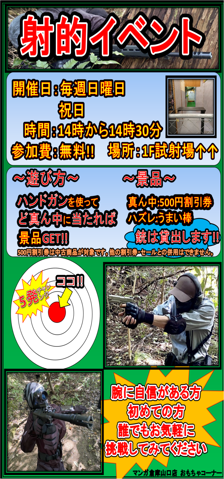 14:00より おもちゃコーナーにて、射的イベントを開催! 参加費は無料、的の真ん中に当たれば割引券が貰えちゃいます! 15:00より 週末ビンゴ開催! 14:30より店内エスカレーター前にてビンゴカードを配布致します!…