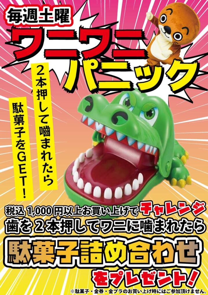 イベントのご案内です☆ 本日土曜日、一階二階レジにて “ワニワニパニックチャレンジ“を開催中☆ 税込¥1000以上お買い上げでチャレンジ出来ます!! 歯を2本押して噛まれたら駄菓子詰め合わせをプレゼント🎁…