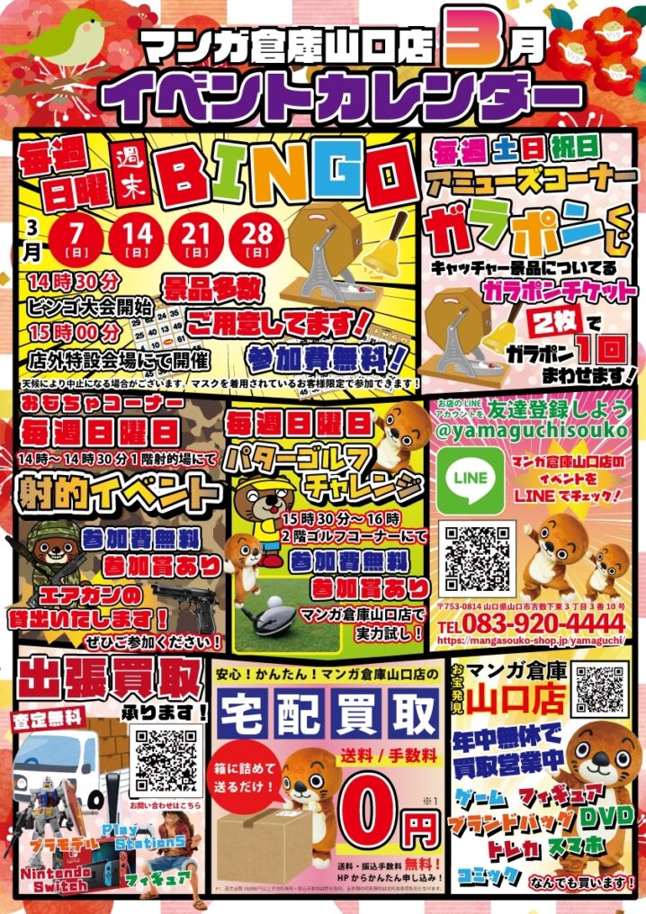 マンガ倉庫山口店! 3月のイベント情報のご案内です! 3月も【週末BINGO】【パターゴルフチャレンジ】など楽しいイベント盛りだくさん✨ 毎週土日祝開催! *アミューズコーナーガラポン* 毎週日曜開催! *…