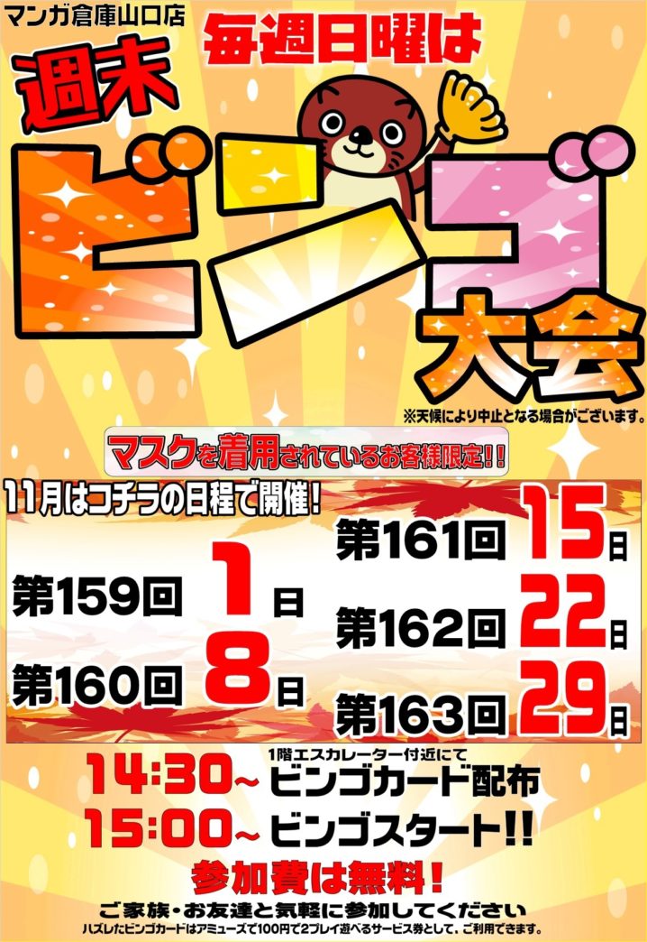 本日8日、マンガ倉庫山口店では 15:00よりビンゴ大会を開催いたします! 14:30より1階エスカレーター付近にて、ビンゴカードを配布いたしますので、 是非当店にご来店ください! また野外ではラッコドームも登場! お子…