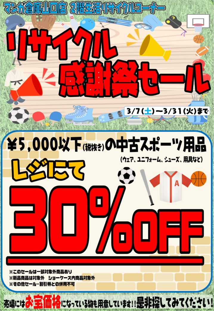リサイクル感謝祭セール実施中♪ マンガ倉庫山口店 2階生活リサイクルコーナーにて 5000円以下の商品の中古スポーツ用品 (ウェア.ユニフォーム.シューズ等々)が30%OFFになります♪ 是非店頭にてお買い求めください!…