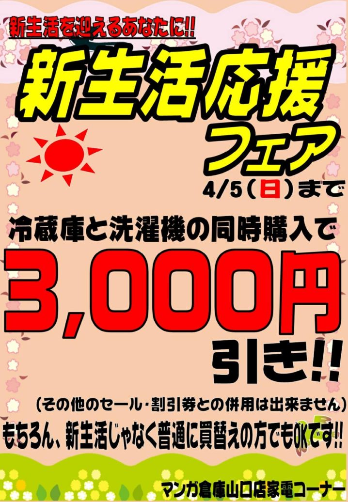家電コーナーより 入学、卒業、就職、新生活を始める貴方のために、新生活応援フェアを開催!! 生活必需品の冷蔵庫と洗濯機を同時購入すると3000円引きになるお得なセールです! マンガ倉庫山口店はあなたの新生活…