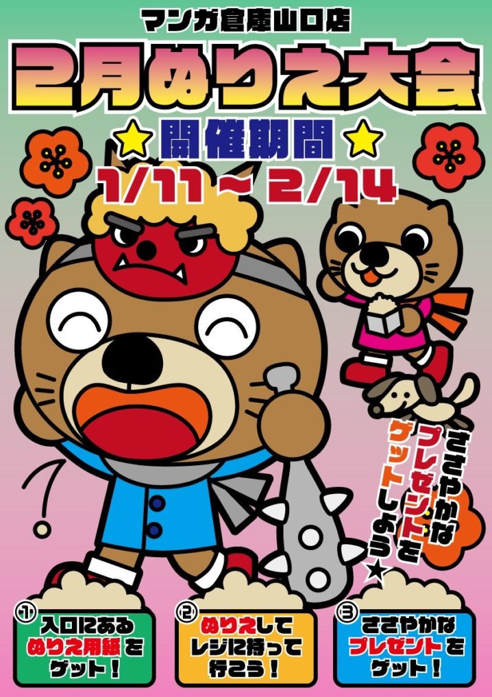 ぬりえ大会第2弾開催! 今回は「節分」と「バレンタイン」が題材です。 1階エスカレーター前にて用紙を用意しています。 色鉛筆も用意していますのでお母さんの買い物を待っている間お父さんと塗る事もできます。 塗り終わったら1…