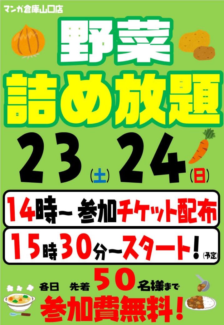 11/23・11/24限定!! 野菜詰め放題開催しちゃいます°˖✧◝(⁰▿⁰)◜✧˖° 14時から参加チケット配布! 15時半スタートです!! 先着50名様限定!! 参加費無料!! 皆様のご来店お待ちしてお…