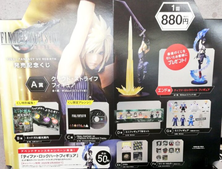 明日朝10時より販売開始‼️ FF7リバース発売記念くじ 1回880円 A賞は主人公クラウド・ストライフのエフェクト付きスケールフィギュアで登場‼️ 読めば 街 ミ…