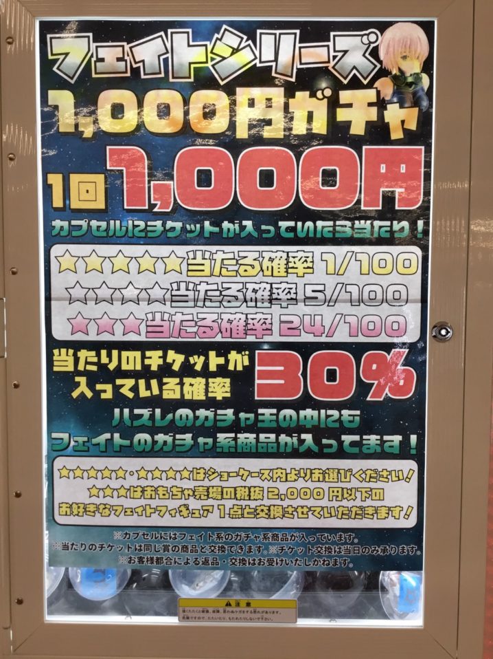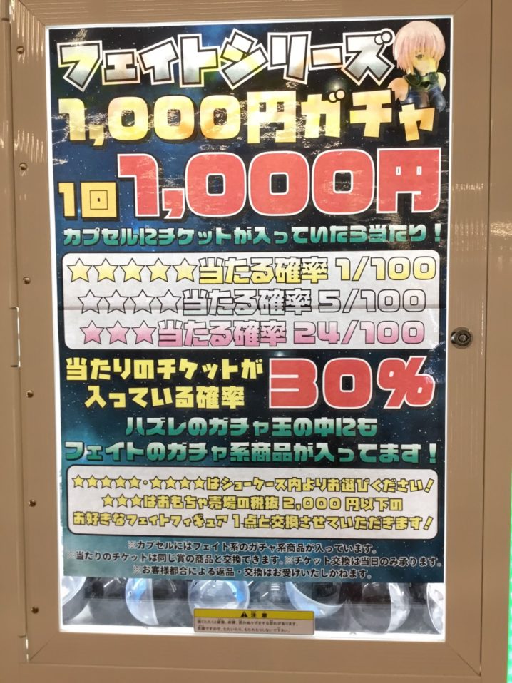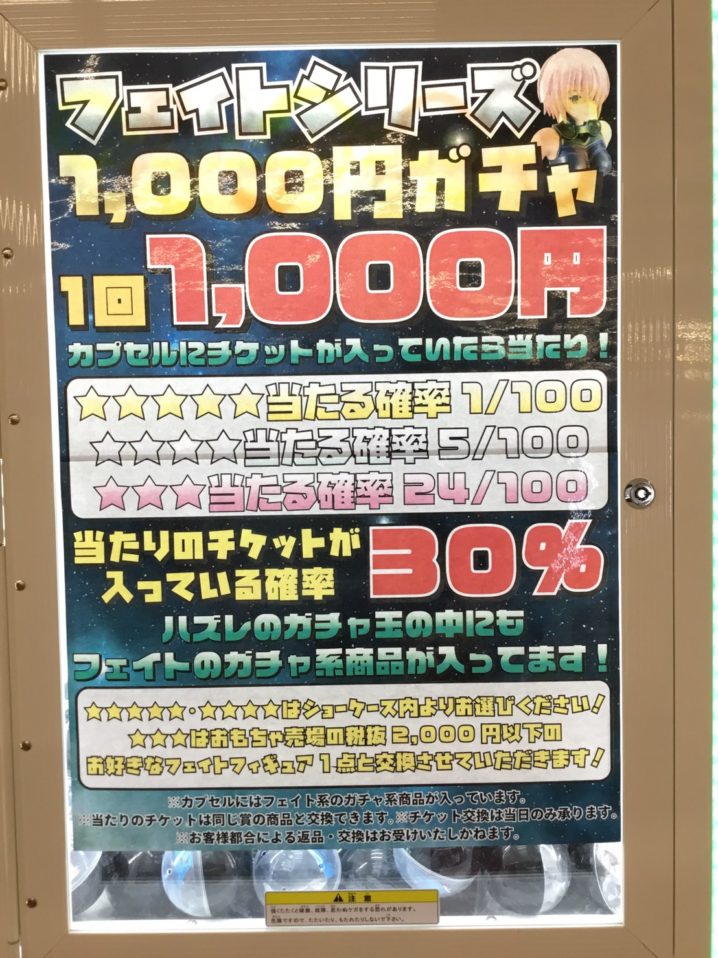 フェイト千円ガチャ好評稼働中です!! 当店へお越しの際は是非回してみてください(∩´∀`)∩
