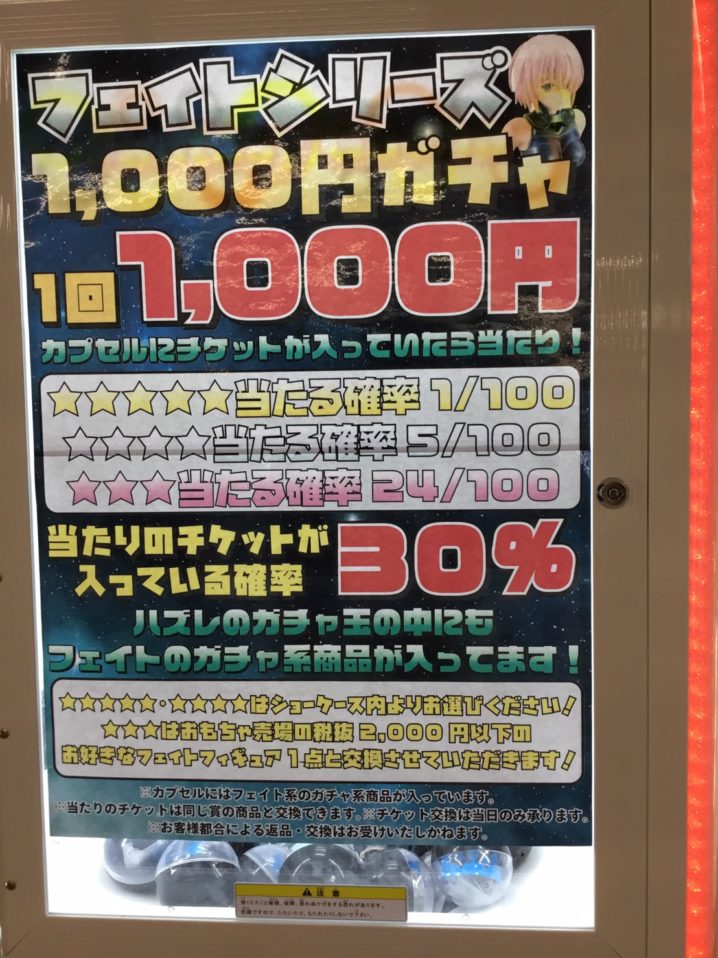 ★おもちゃコーナーよりお知らせ★ フェイト千円ガチャ好評稼働中です! よろしくお願いします!