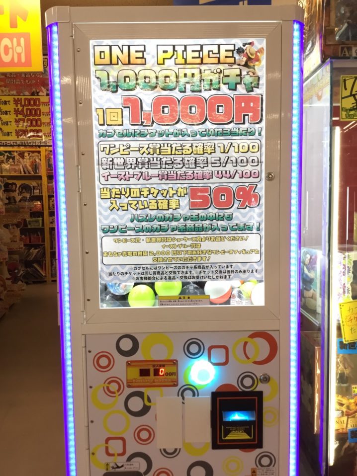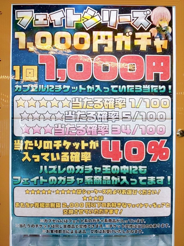 おもちゃコーナー ワンピース、フェイト千円ガチャ始めました! 特賞にはPOPナミ ニューバージョン、 アニプレックス セイバーアルトリアペンドラゴン豪華版など入っています! フィギュアがバンバン当たる、超お買い得なガチャ…