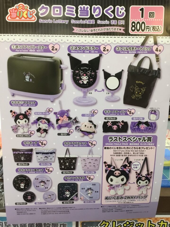 ★おもちゃコーナーより最新情報のご案内★ サンリオ当たりくじクロミ当たりくじ ハズレ無し、一回800円(税込み) 明日朝9時より販売します。