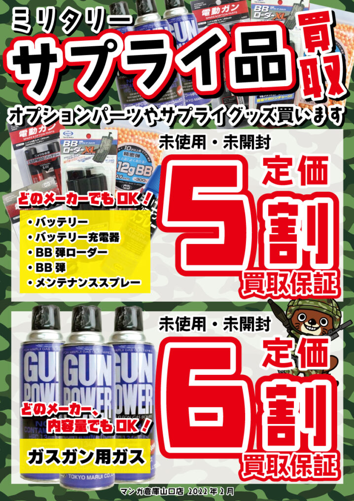★買取情報★ ただいま当店では、ガスガンや電動ガン用の「オプションパーツ」や「サプライグッズ」を買取強化中です! ■バッテリー ■バッテリー充電器 ■BB弾ローダー ■BB弾 ■メンテナンススプレー →未使…