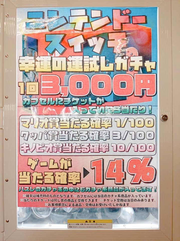 ★お知らせ★ NintendoSwitchニンテンドースイッチ3000円ガチャ 景品補充しました! 新型本体やスイッチライト、リングフィットアドベンチャー 入っています! よろしくお願いいたします! &nb…