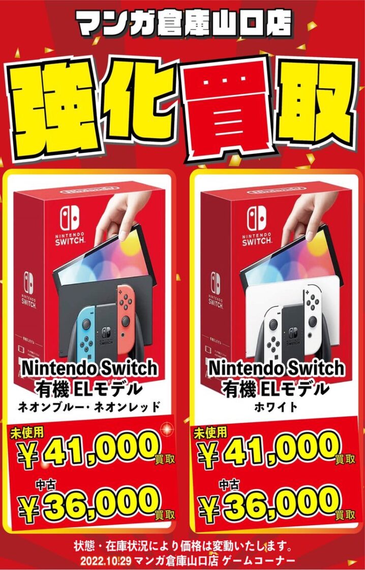 ゲームコーナーより マンガ倉庫山口店では ニンテンドースイッチを買取強化中です!! ●スイッチ有機ELモデル ネオンブルー/ネオンレッド、ホワイト 未使用美品で 41,000円買取🎉 中古美品で 36,0…