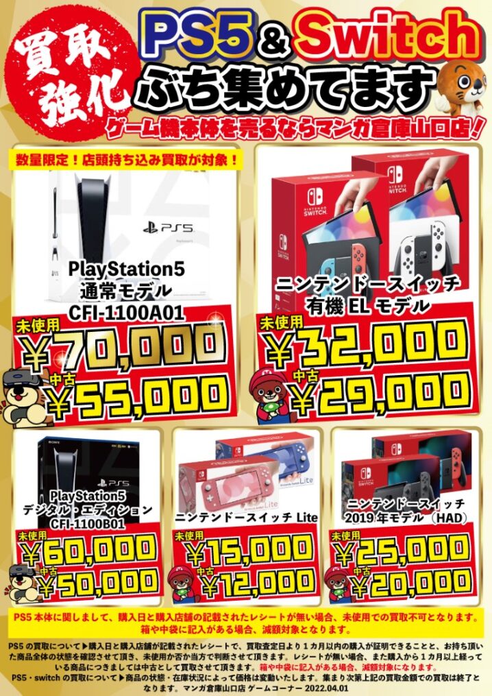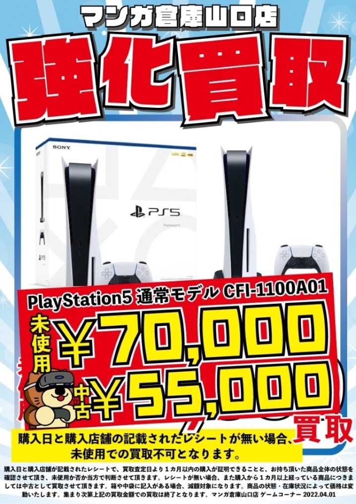 ★★★PS5本体 買取強化中★★★ ただいまマンガ倉庫山口店では 数量限定!店頭持ち込み買取が対象で、 プレイステーション5 通常モデル CFI-1100A 未使用美品 70,000円 買取実施中❣…