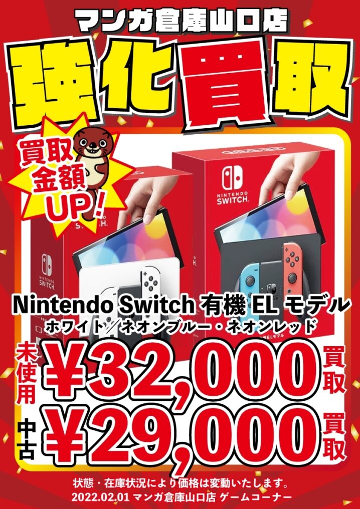 ★買取情報★ ただいまマンガ倉庫山口店では、 ニンテンドースイッチ有機ELモデル未使用美品を 32,000円買取 しております☺️✨ ただいま買取金額アップ中です!!!!!!! …