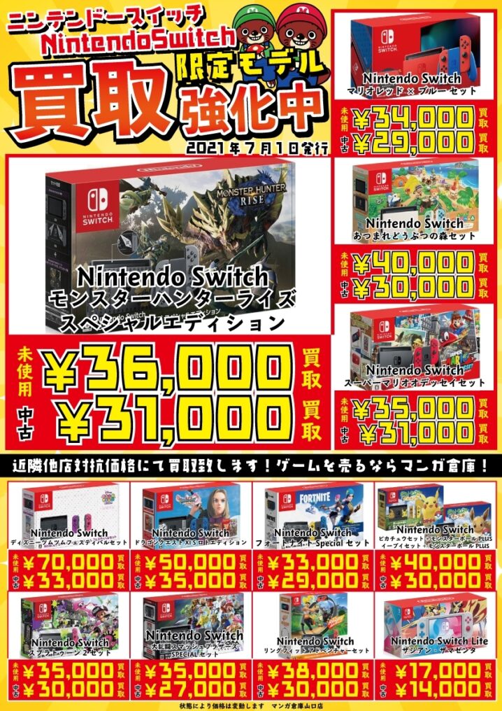 7月もマンガ倉庫山口店では、ゲーム機本体を買取しています! とくに、 ★NintendoSwitchモンスターハンターライズスペシャルエディション 未使用36,000円買取 ★NintendoSwitch マリオレッド×…