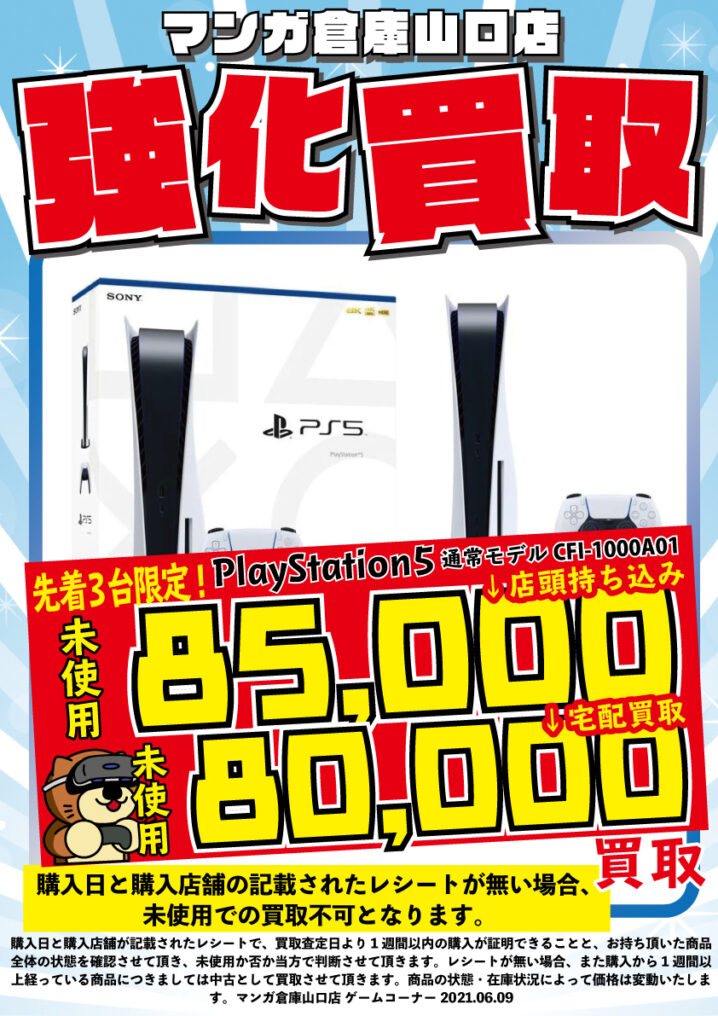 ★買取情報★ ただいまマンガ倉庫山口店では PlayStation5 本体を 先着3名様限定で、特別価格にて買取中です! PlayStation5 CFI-1000A01 通常モデル 店頭買取金額:未使用85,000円買…