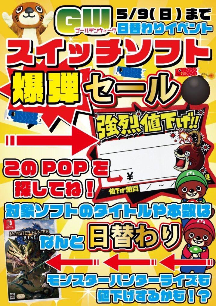 ゴールデンウィーク日替わりイベント ✨✨スイッチソフト爆弾セール本日最終日です!✨✨ 🍀本日の対象ソフトは ⭐ニンテンドウ ・スーパー…