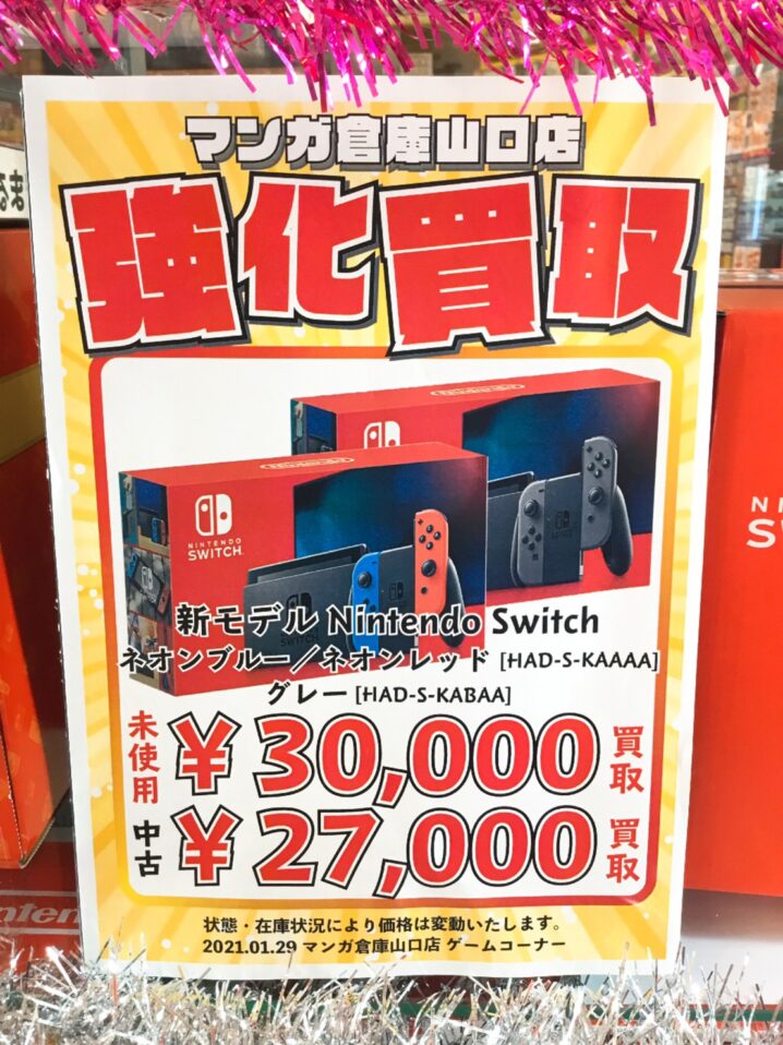ゲームコーナーより ☆Nintendo Switch ネオンブルー/ネオンレッド 新品¥33900 未使用品¥33800 グレー 新品¥34900 ☆Nintendo Switch Lite コーラル、イエ…