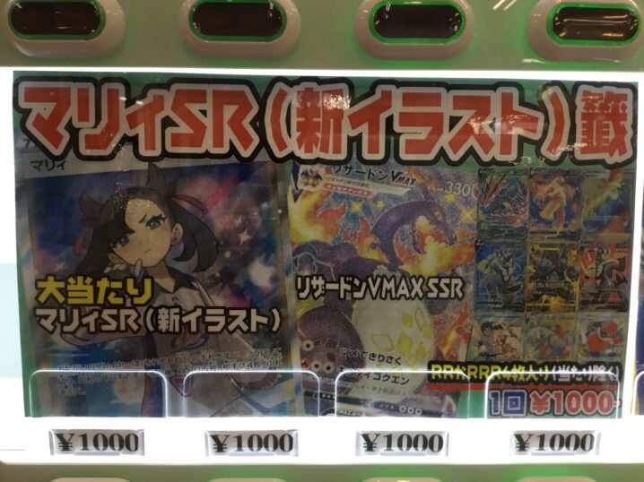 カードコーナーより 自販機企画 「マリィSR籤」作りました! 大当たりは「マリィSR(新イラスト)」です! 他にも「リザードンVMAX SSR」「セキタンザン UR」「れんげきウーラオスV SR」など当たります! 是非チ…