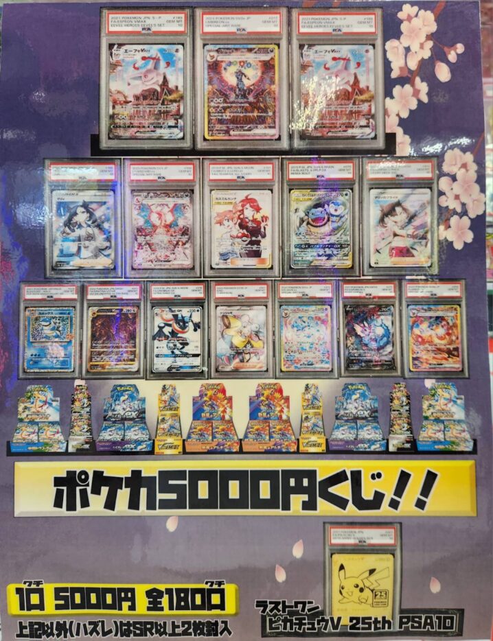 カードコーナーより ポケモンカード5000円くじ作りました! 当たりは ブラッキーex SAR PSA10 エーフィVMAX PSA10 マリィ SR PSA10 カスミ&カンナ PSA10 など ラストワンは ピカチュ…