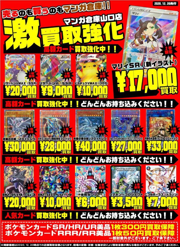★買取情報★ 激強化買取! マリィSR(新イラスト)17000円買取 リザードンVMAX/SSR 20000円買取 青眼の白龍20thシク 30000円買取 全能ゼンノー 6000円買取 BM2-053ターレス 2000…