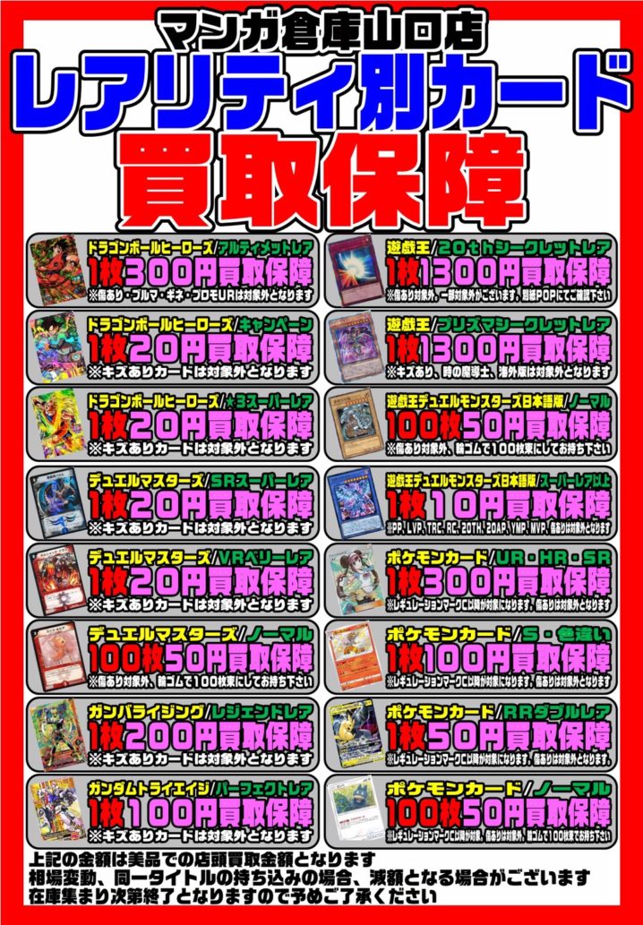 ★買取情報★ カードコーナーより買取保証の情報です。 デュエルマスターズ ベリーレア/スーパーレア 20円買取保障! ポケモンカード SRスーパーレア以上(レギュC以降) 300円買取保障! RRダブルレア(レギュC以降…