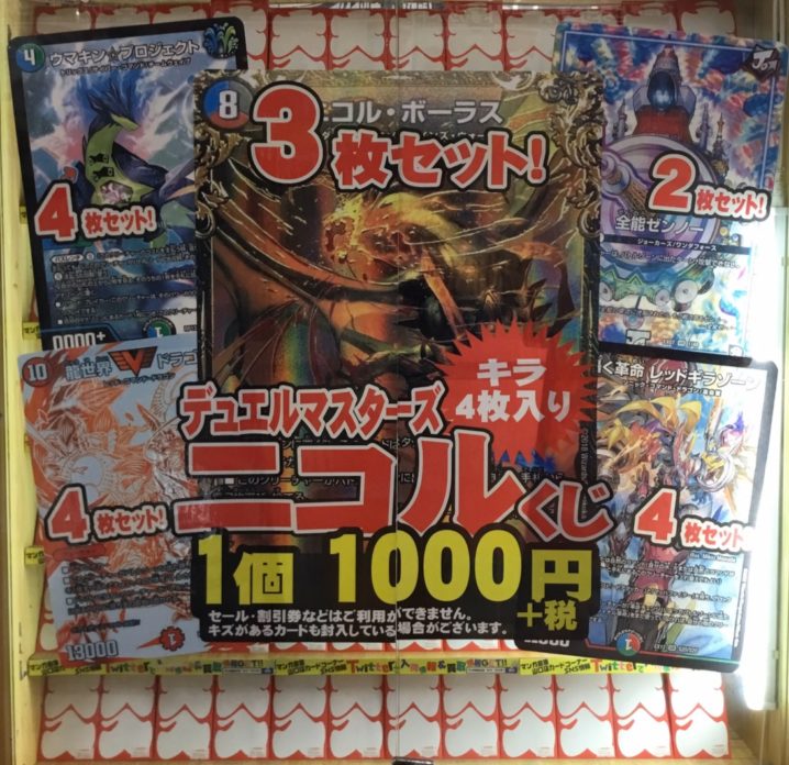 カードコーナーより デュエルマスターズ「ニコルくじ」作りました! 大当たりは「ニコル・ボーラス3枚セット」です! 他にもウマキン⭐️プロジェクト、全能ゼンノーなどあります。 是非チャレンジして…