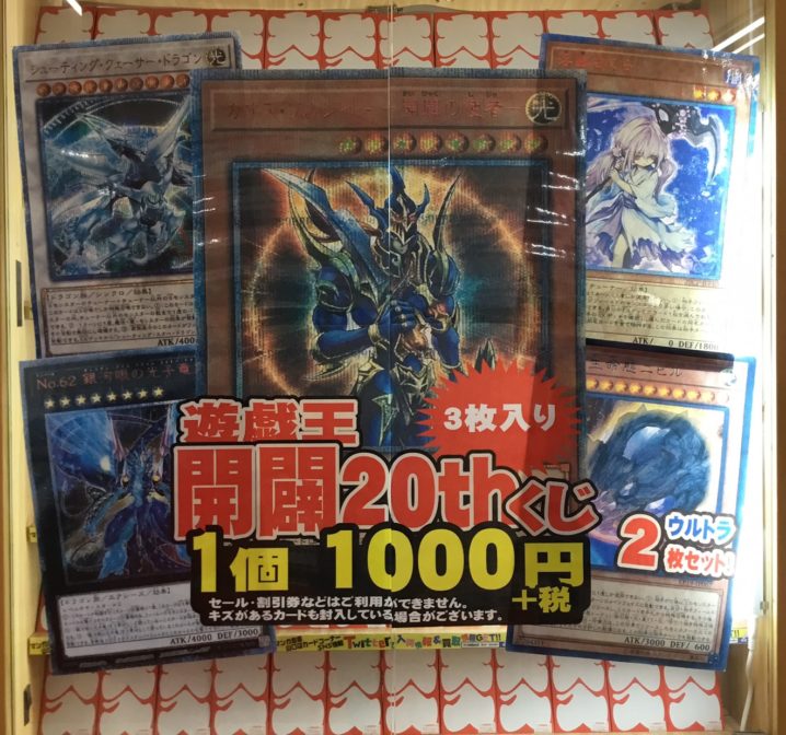 カードコーナーより 遊戯王「開闢20thくじ」作りました! 今回の大当たりは「カオス・ソルジャー ー開闢の使者ー 20thシークレット」です! 他にも「浮幽さくら 20thシークレット」「シューティング・クェーサー・ドラ…