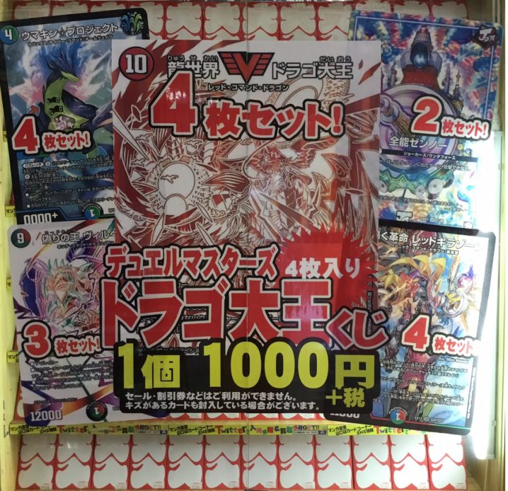 カードコーナーより デュエルマスターズ「ドラゴ大王くじ」作りました! 今回の大当たりは「ドラゴ大王4枚セット」です! 他にもレッドギラゾーン、ウマキン⭐️プロジェクトなどあります! ぜひチャレ…