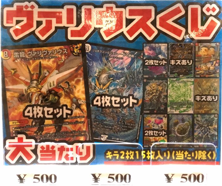 ★カードコーナーよりお知らせ★ デュエルマスターズ「ヴァリヴァリウスくじ」作りました! 大当たりは「ヴァリヴァリウス4枚セット」です!他にもガイギンガ、ホーリーエンドなどあります! 是非チャレンジしてみてく…