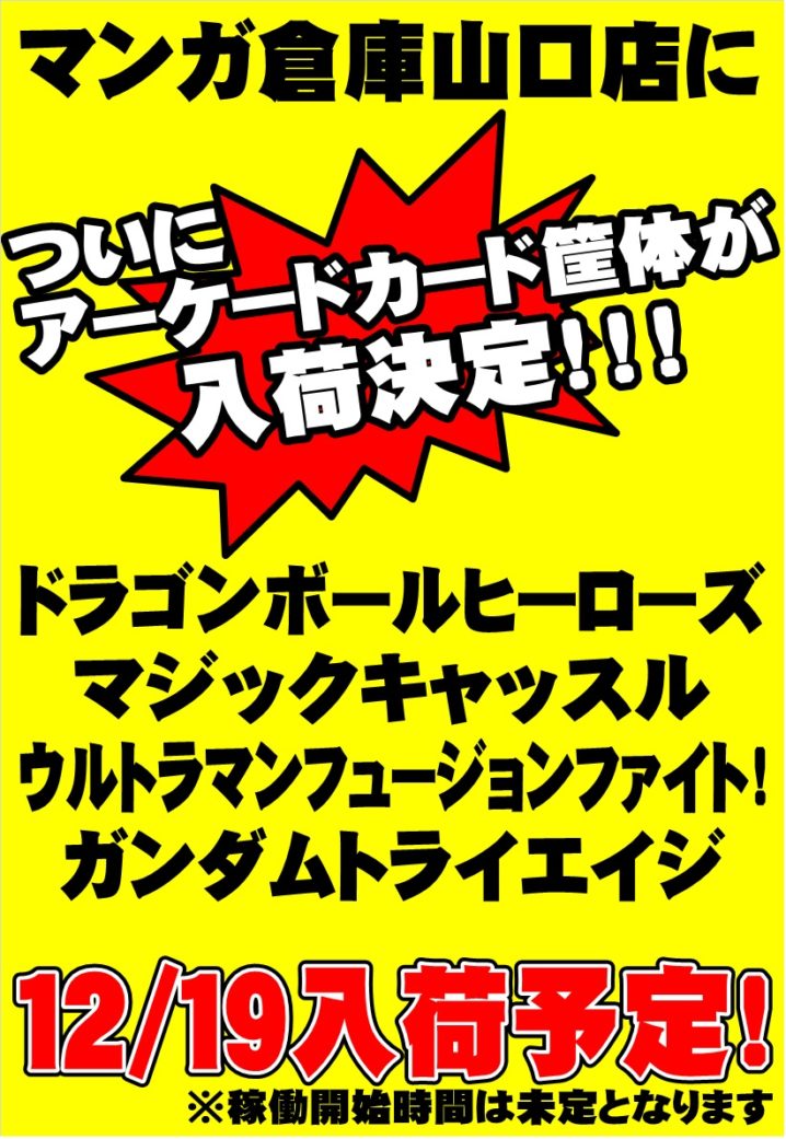 マンガ倉庫山口店に 遂にアーケードカード筐体が入荷決定! ・ドラゴンボールヒーローズ ・マジックキャッスル ・ウルトラマンフュージョンファイト! ・ガンダムトライエイジ 12/19入荷予定!是非お越しください♪