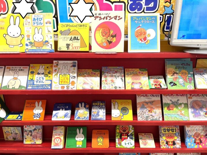 本コーナーからのお知らせ! 人気キャラクターの絵本、販売中です! 通常の絵本の他に、数の数え方、あいうえおなどを教えてくれる本もございます! アンパンマンやミッフィー、こぐまちゃんなど子供たちに親しまれているキャラクター…