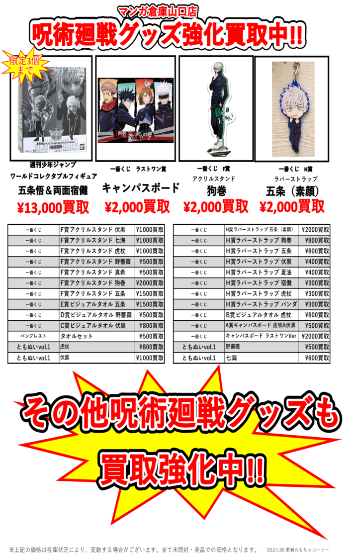 おもちゃコーナーより 呪術廻戦グッズ買取強化中!! 一番くじ,フィギュア,アクリルスタンド,キーホルダー,ぬいぐるみ等、 呪術廻戦グッズをマンガ倉庫山口店に売って下さい!! リストに載ってないものもドシドシお待ちしており…