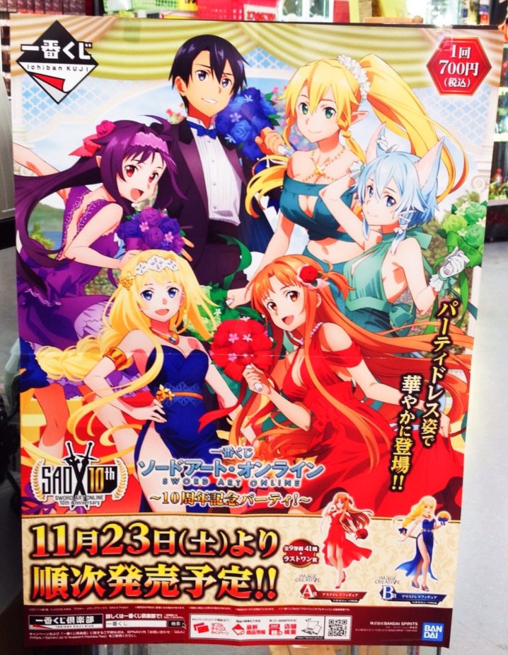 ★おもちゃコーナーより一番くじ入荷予定★ ソードアート・オンライン〜10周年記念パーティ!〜 ドレスフィギュア・クッション・アクリルスタンド・ミニポスター・ラバーストラップがラインナップ 11月23日(土)朝9時発売です…