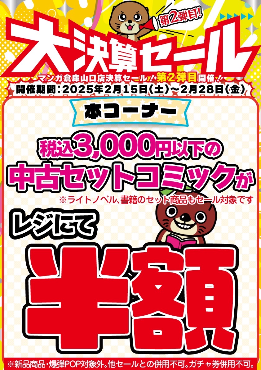 2025.02.28 イベント情報 takalab_2 ■《2月28日》コミックコーナー! ご好評頂きました大決算セールも本日が最終日!■ X.com Facebook はてブ LINE Pocket 本コーナーからのお知らせ! ご好評頂きました大決算セールも本日が最終日! 本コーナーでは税込み3000円以下の中古セットコミックがレジにて半額! 呪術廻戦やスパイファミリーなど人気作品もセール対象になっていますよ! ライトノベルや書籍のセット商品もセール対象となっておりますので、ぜひコチラもご利用ください! 皆様のご来店お待ちしております!! ※2025/2/28現在の価格となります。 在庫状況などによってお値段が変動いたします。予めご了承ください。 シェア! X.com Facebook はてブ LINE Pocket feedly コメントを残す コメントをキャンセルメールアドレスが公開されることはありません。 ※ が付いている欄は必須項目ですコメント ※ 名前 ※ メール ※ サイト 新しいコメントをメールで通知 新しい投稿をメールで受け取る Δ このサイトはスパムを低減するために Akismet を使っています。コメントデータの処理方法の詳細はこちらをご覧ください。