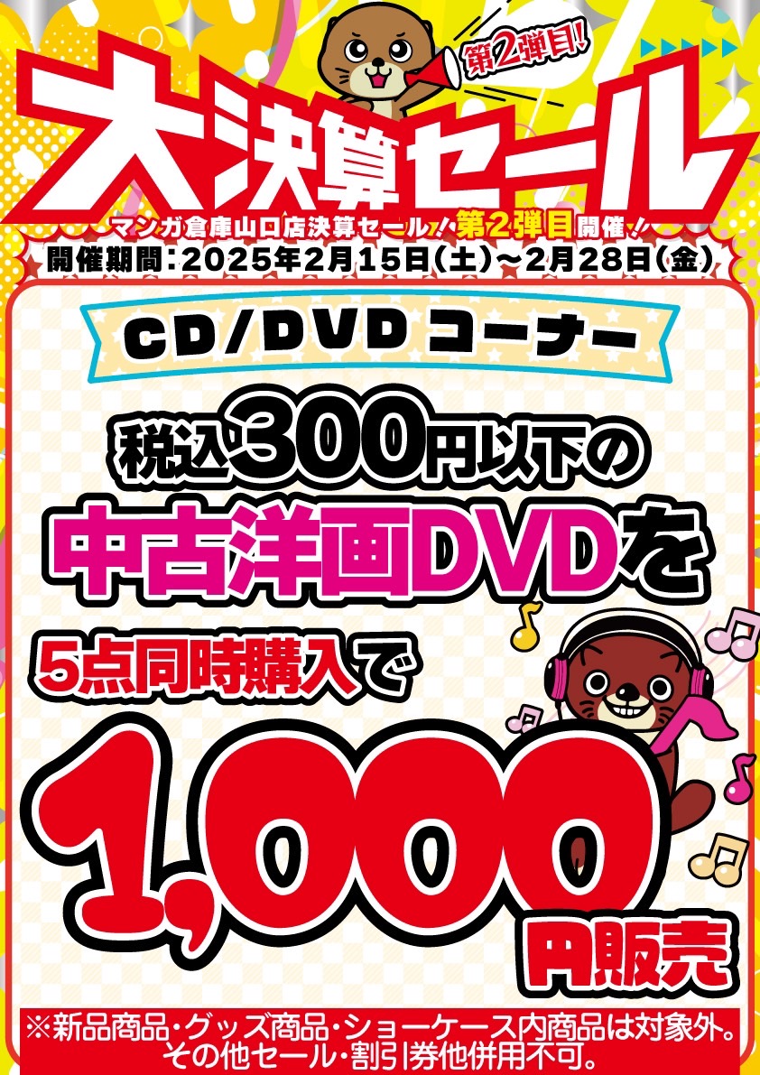 2025.02.28 イベント情報 takalab_2 ■《2月28日》本日最終日!CD/DVDコーナー大感謝セール!■ X.com Facebook はてブ LINE Pocket CD・DVDコーナーからのお知らせ! 本日最終日!大感謝セール! CD・DVDコーナーでは税込み300円以下の中古洋画DVDを5点同時購入で1,000円販売いたします! マトリックスシリーズやファンタスティック・フォーなど名作アクション映画もセール対象になっています! セール最終日、是非CD・DVDコーナーへ足をお運びください! ※2025/2/28現在の価格となります。 在庫状況などによってお値段が変動いたします。予めご了承ください。 シェア! X.com Facebook はてブ LINE Pocket feedly コメントを残す コメントをキャンセルメールアドレスが公開されることはありません。 ※ が付いている欄は必須項目ですコメント ※ 名前 ※ メール ※ サイト 新しいコメントをメールで通知 新しい投稿をメールで受け取る Δ このサイトはスパムを低減するために Akismet を使っています。コメントデータの処理方法の詳細はこちらをご覧ください。