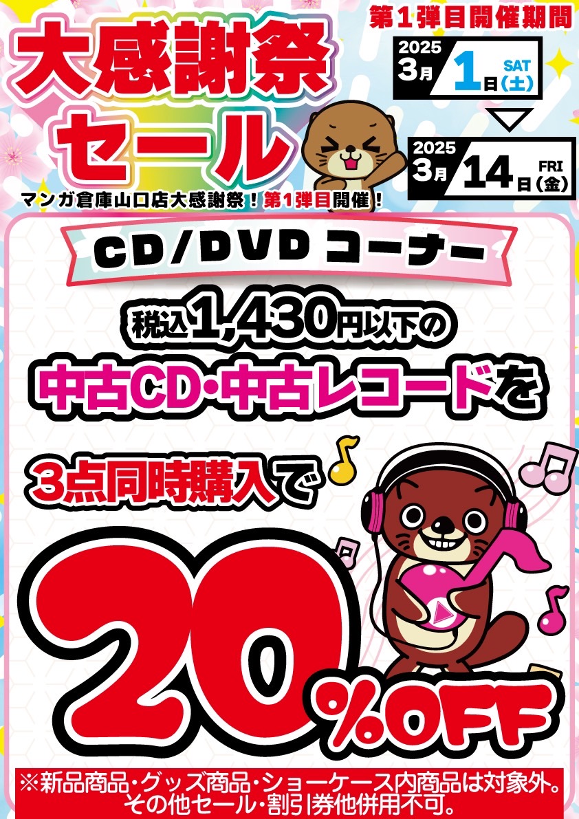 2025.03.01 イベント情報 takalab_5 CD・DVDコーナーからのお知らせ!◆現在当店では大感謝祭セールを開催中です! X.com Facebook はてブ LINE Pocket CD・DVDコーナーからのお知らせ!💿📀 現在当店では大感謝祭セールを開催中です! CD・DVDコーナーでは「税込み1,430円以下の中古CD・中古レコードを3点同時購入で20%オフ」を実施中! 邦楽CD・洋楽CD・映画やアニメ、ゲームのサントラ、ユーロビートやテクノ系のオムニバスなど全てセール対象となっております! 開催は3月14日まで! 是非CD・DVDコーナーへお立ち寄りくださいませ! シェア! X.com Facebook はてブ LINE Pocket feedly コメントを残す コメントをキャンセルメールアドレスが公開されることはありません。 ※ が付いている欄は必須項目ですコメント ※ 名前 ※ メール ※ サイト 新しいコメントをメールで通知 新しい投稿をメールで受け取る Δ このサイトはスパムを低減するために Akismet を使っています。コメントデータの処理方法の詳細はこちらをご覧ください。