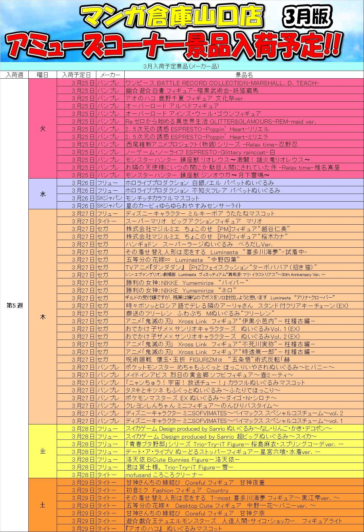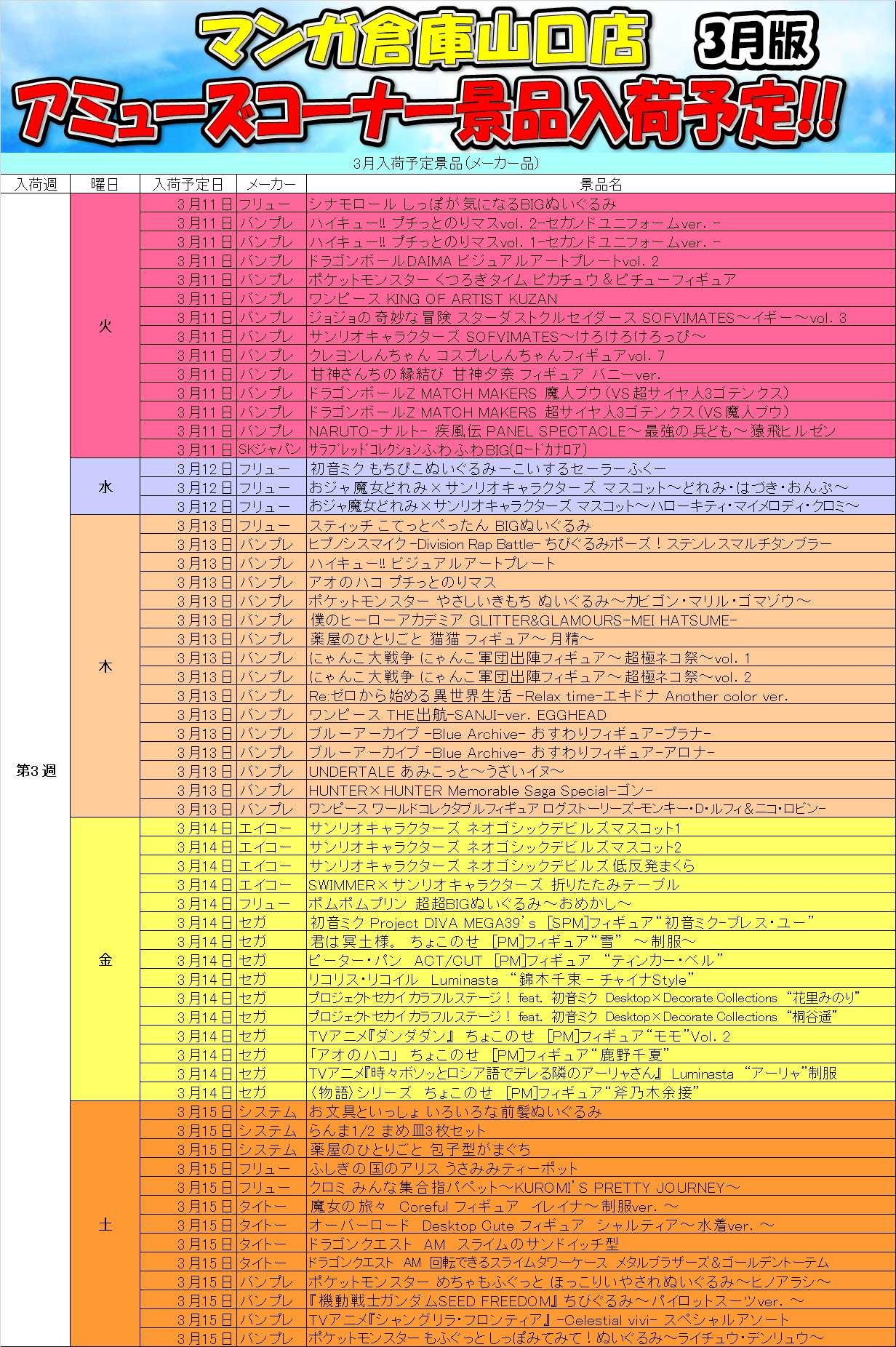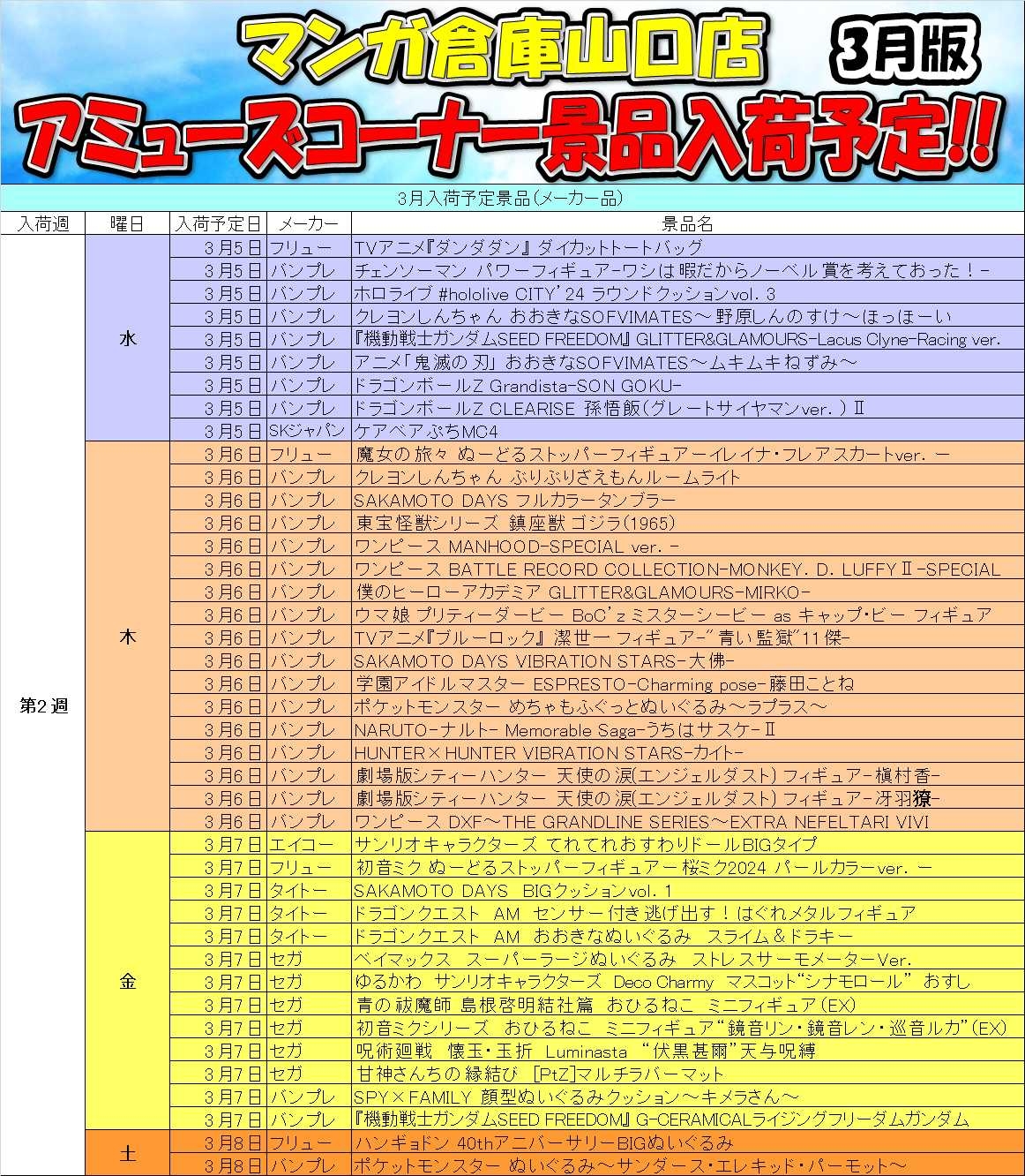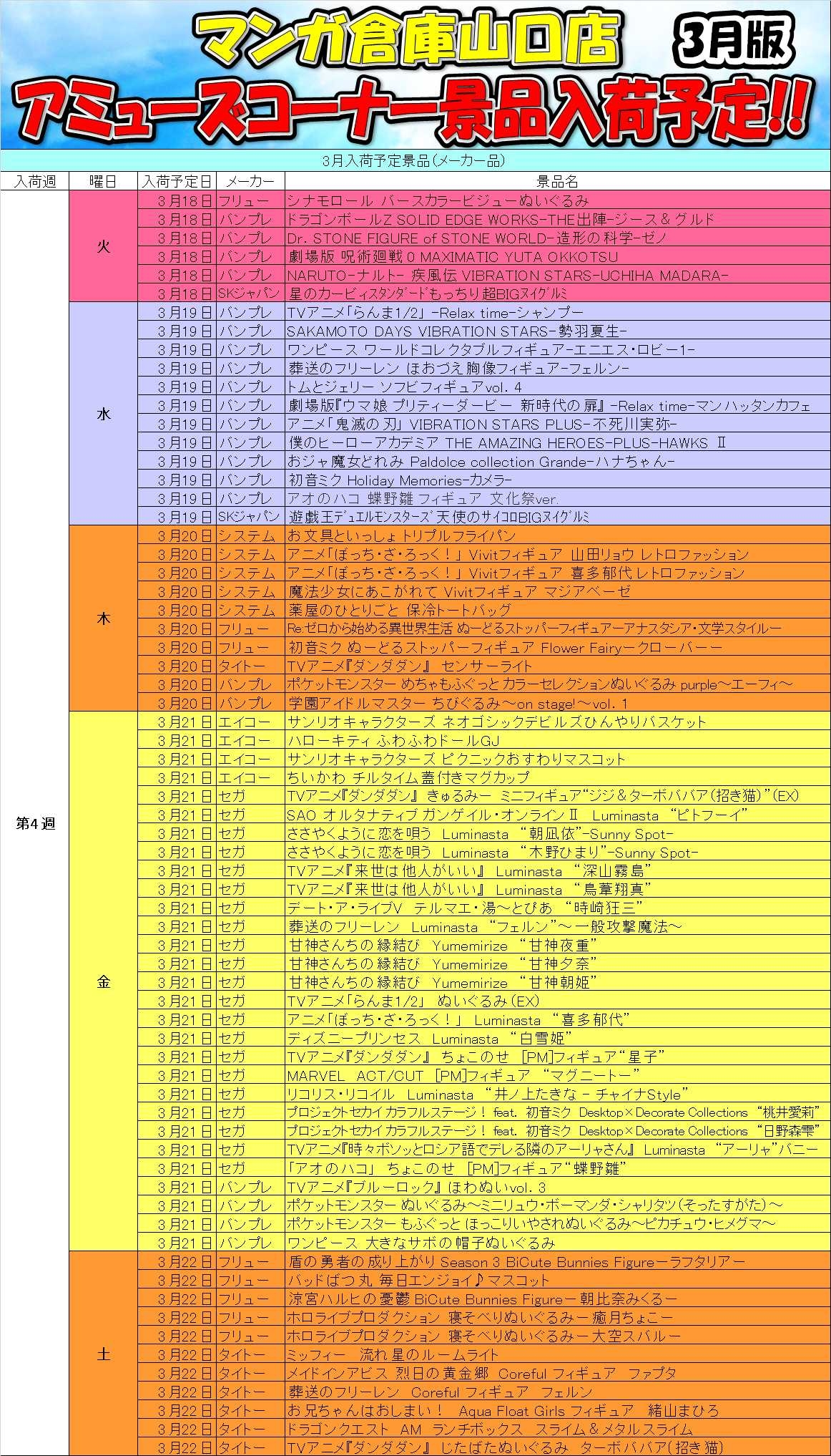 2025.03.01 アミューズ takalab_5 ★1Fアミューズメントコーナーより 3月の入荷予定景品です★ X.com Facebook はてブ LINE Pocket ★1Fアミューズメントコーナーより 3月の入荷予定景品です★ シェア! X.com Facebook はてブ LINE Pocket feedly コメントを残す コメントをキャンセルメールアドレスが公開されることはありません。 ※ が付いている欄は必須項目ですコメント ※ 名前 ※ メール ※ サイト 新しいコメントをメールで通知 新しい投稿をメールで受け取る Δ このサイトはスパムを低減するために Akismet を使っています。コメントデータの処理方法の詳細はこちらをご覧ください。