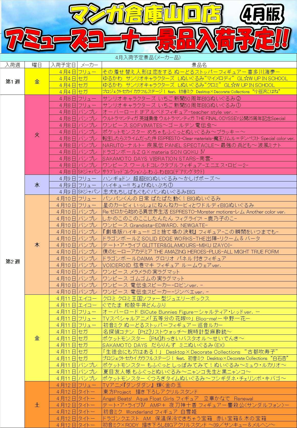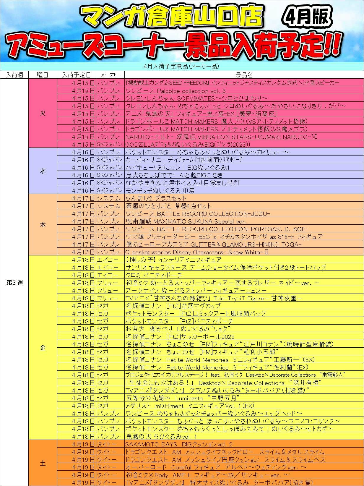 2025.03.30 アミューズ takalab_5 ★1Fアミューズメントコーナーより 4月の入荷予定景品です★ X.com Facebook はてブ LINE Pocket ★1Fアミューズメントコーナーより 4月の入荷予定景品です★ シェア! X.com Facebook はてブ LINE Pocket feedly コメントを残す コメントをキャンセルメールアドレスが公開されることはありません。 ※ が付いている欄は必須項目ですコメント ※ 名前 ※ メール ※ サイト 新しいコメントをメールで通知 新しい投稿をメールで受け取る Δ このサイトはスパムを低減するために Akismet を使っています。コメントデータの処理方法の詳細はこちらをご覧ください。